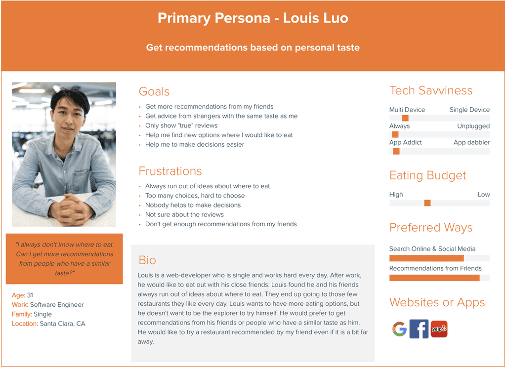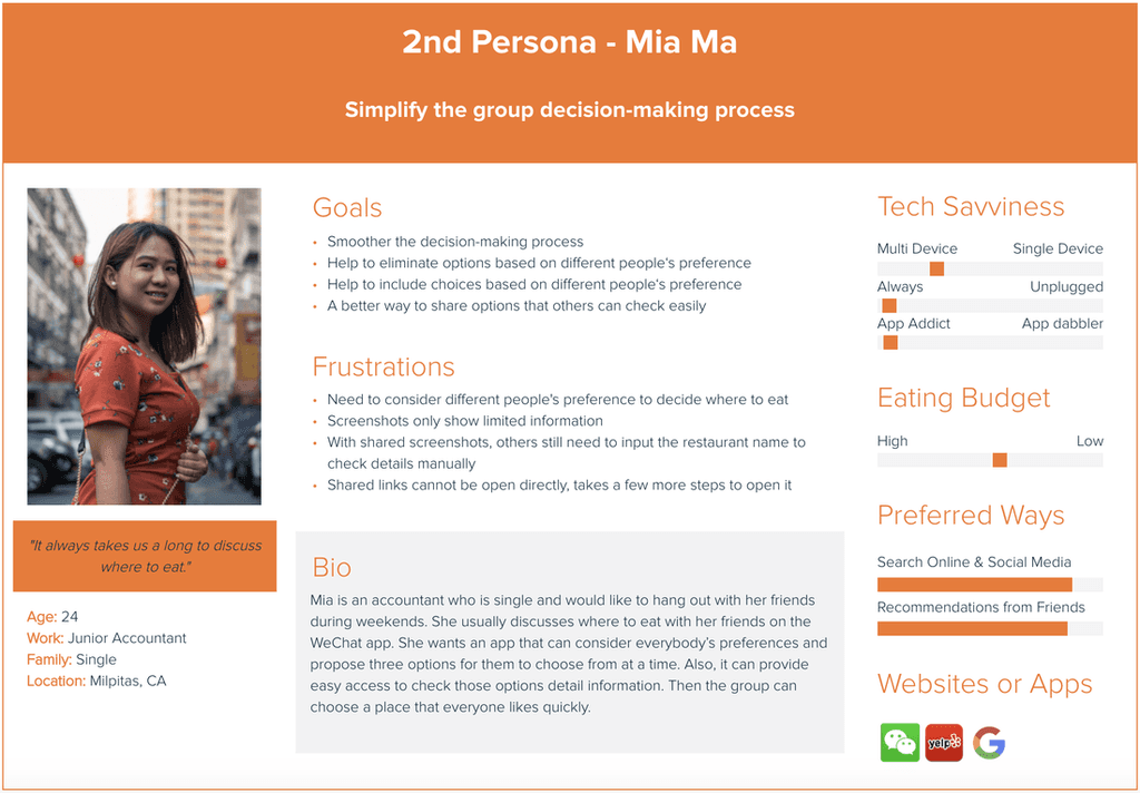 The discovery phase helped me understand the users' goals and major pain points. I elaborated on the data collected and compared it with the current state of restaurant-finding apps in the market. From there, I created user stories and developed an MVP list.