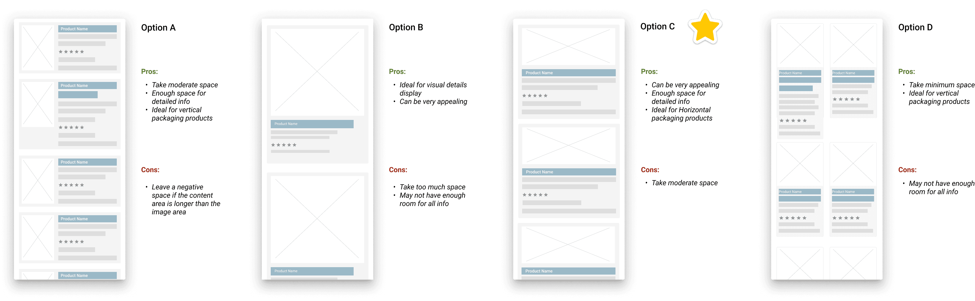 The product card is the cornerstone of the store experience. I explored three variants that balanced: