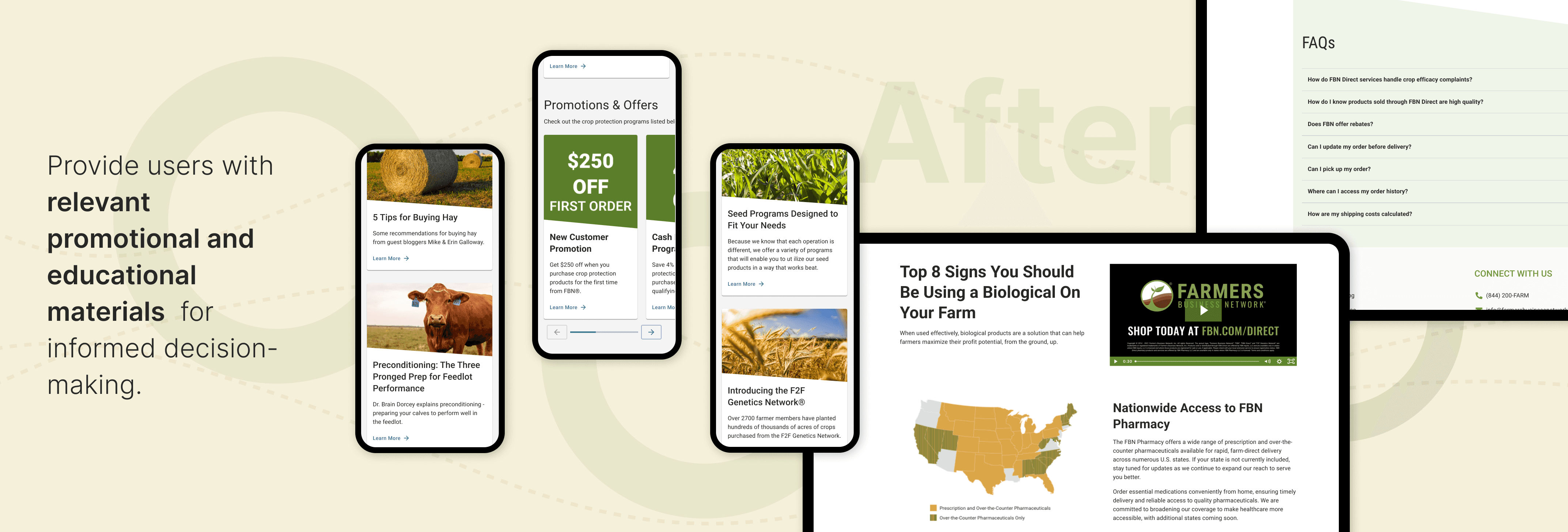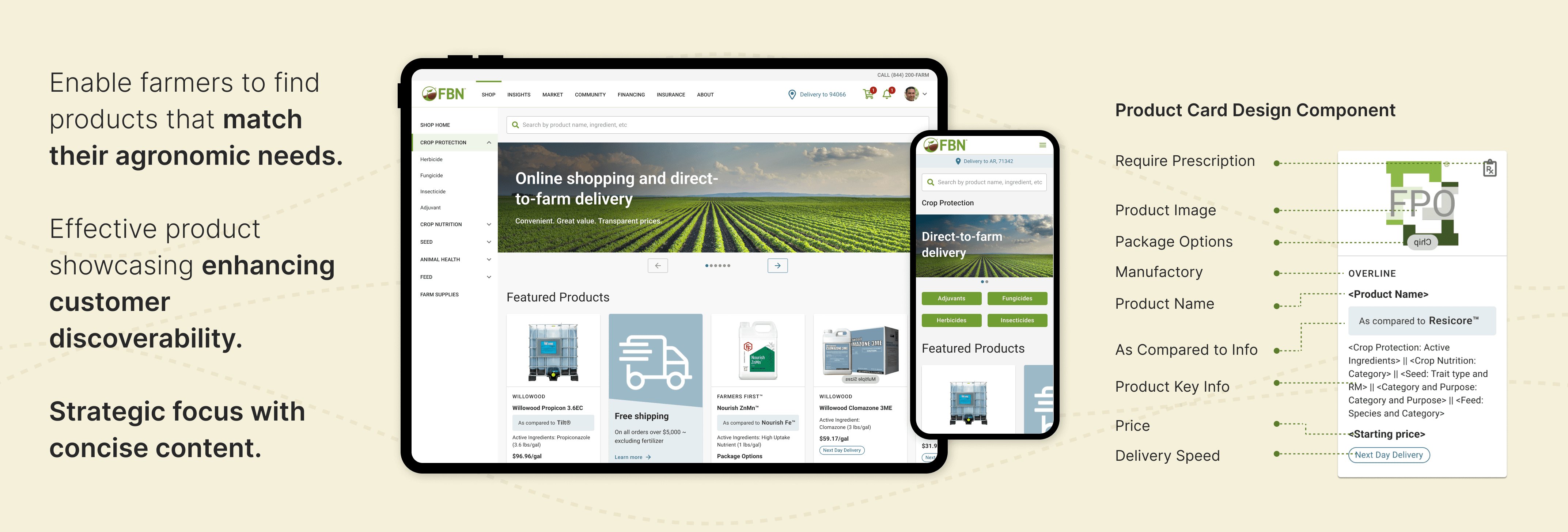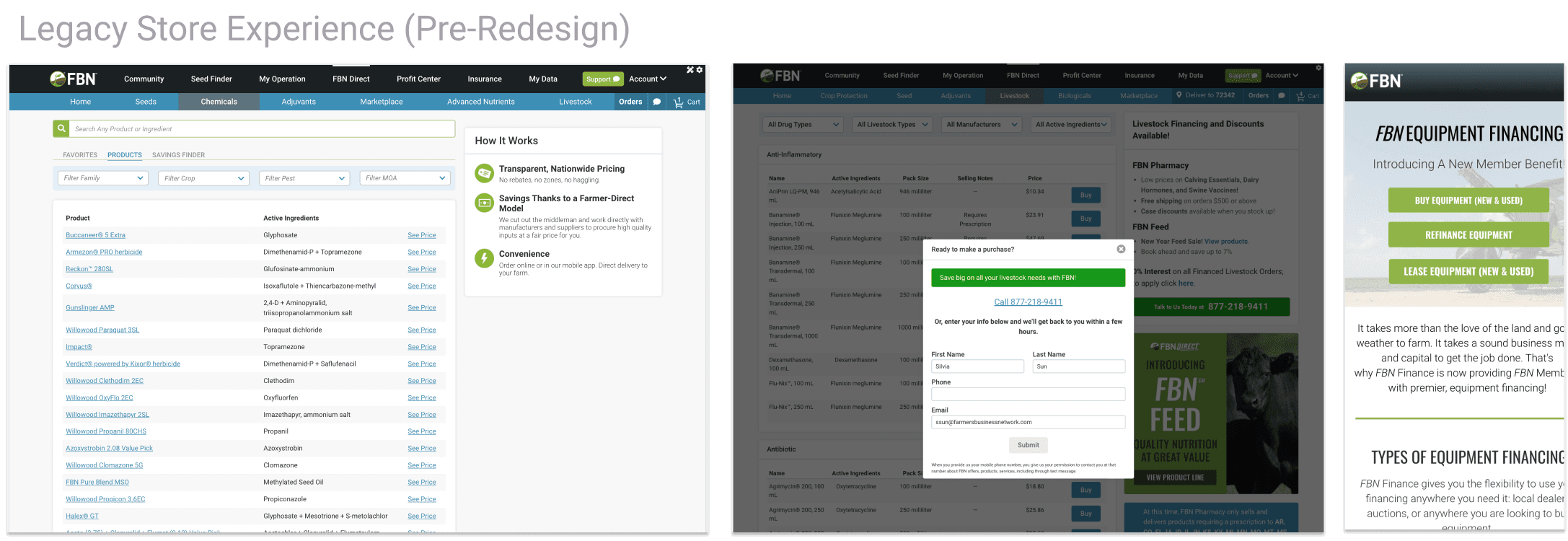 FBN’s Store had outgrown its legacy interface. Although product offerings had expanded dramatically, the site still relied heavily on sales representatives to guide farmers through SKU selection, pricing, promotional content, and product comparisons.
